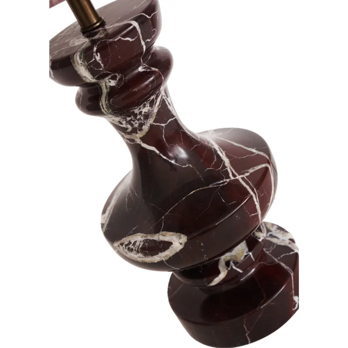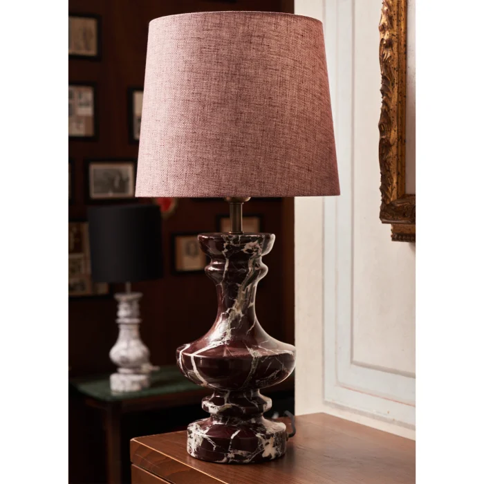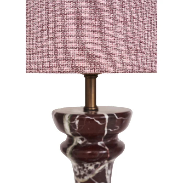 Product Specifications: Overall Dimensions : h70cm. Shade: 27cm X 32cm X h27cm. Main Body: 19cm x h47cm. Product weight: ~10 kg. Ecru Linen Fabric shade.. Fabric Covered Cord.. Cord length: 2,5m. Plug-in with E27 socket.. In-line On/Off rocker switch. . Hi Quality Rosso Levante Marble Main Body. Hi Quality Burgundy Linen Fabric Shade