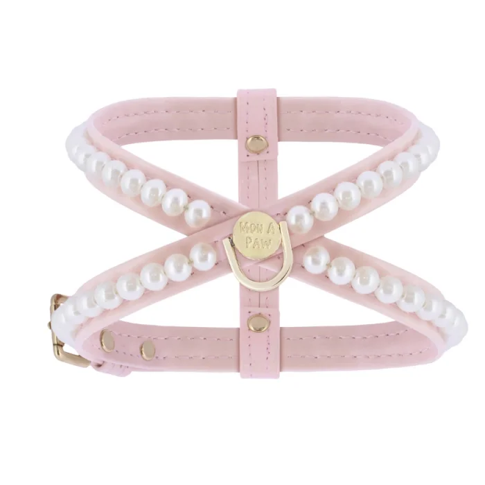 is elegantly embellished with crisp white pearls on bright baby pink vegan-friendly leather. This Harness will be a unique accessory to complement your dog's style on special occasions while providing a great option for everyday wear. You can complete your dog's look with a vegan-friendly leather  walking strap in the same color.