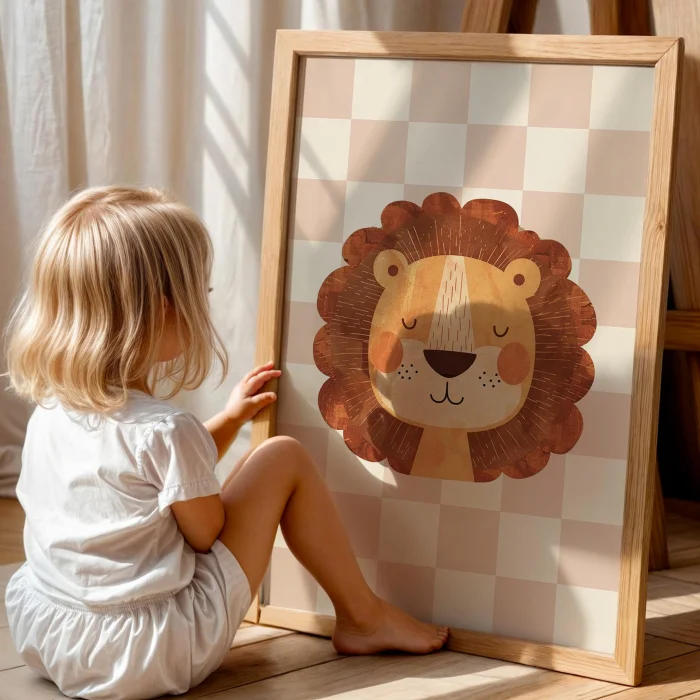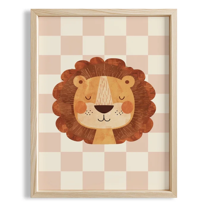 Product: Lion Cute Safari Animals With Pink Checkered Background Kids' Room Wooden Wall Art