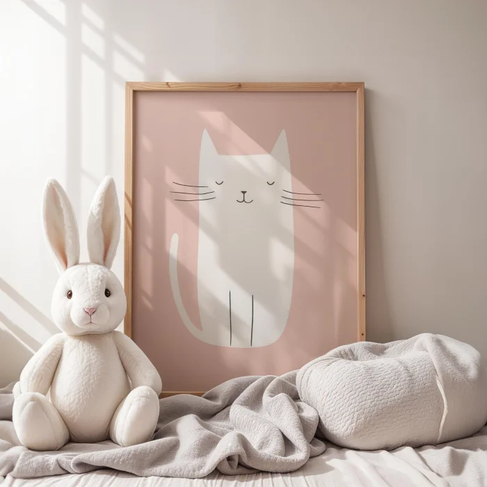 Product: White Cat - Pink Background Children's Room Wooden Framed Wall Art