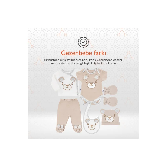 Product Description:Gezenbebe Hero Baby Hospital Outlet Set 6 Pieces: The Perfect Start for the First Big Day in Your Baby's Life! Prepare your newborn for the first important day in his life – the day he leaves the hospital. This special set from Gezenbebe is specially designed to offer your baby both comfort and style. With its gezenbebe quality and iconic patterns, it makes your little hero feel special from the beginning. Set Contents:EMBROIDERED HAT: Soft, breathable and embroidered hat with unique Gezenbebe heroes that will keep your baby's head warm. EMBROIDERED APRON: An embroidered apron inspired by the four heroes of Gezenbebe, offering a stylish solution for small accident moments. EMBROIDERED ZIBIN: A delicate staple decorated with iconic Gezenbebe patterns that will keep your baby clean and dry. BOOTIES: Comfortable pants with integrated booties that keep tiny feet warm. GLOVES: Soft gloves so your baby doesn't scratch himself. EMBROIDERED SHORT SLEEVE BODYSUIT: Breathable and soft short sleeve bodysuit that gently hugs your baby's skin, enriched with embroidery details from our four heroes. Standout Features:GEZENBEBE SIGNATURE:This set offers more than just a Hospital Exit Set; It is a fashion statement of Gezenbebe with its special patterns and detailed embroidery. FULL PROTECTION: Each piece in this set has been carefully selected to ensure that your baby is protected from head to toe. UNIQUE DESIGN OF GEZENBEBE: Elephant, Koala, Teddy Bear and Rabbit; The four beloved heroes of Gezenbebe bring your baby together with a unique elegance with this set.ULTIMATE COMFORT: Made of 100% breathable cotton fabric, this set offers your baby the highest comfort. UNISEX ELEGANCE: With its fashionable patterns, your baby feels ready in every sense. EASY TO USE: Nickel-free snap buttons offer quick and convenient use. GREAT GIFT: An ideal gift for new parents or your own baby. Technical Details:Size Options: 0-3 months, 3-6 months, 6-9 monthsColor Options: Bunny, Elephant, Koala, Teddy (Organic). Review the size chart before completing the order. With the Gezenbebe Hero Baby Hospital Exit Set, your baby is ready to meet the world in a stylish and comfortable way. Every moment is precious, and with Gezenbebe, these first moments are even more special.