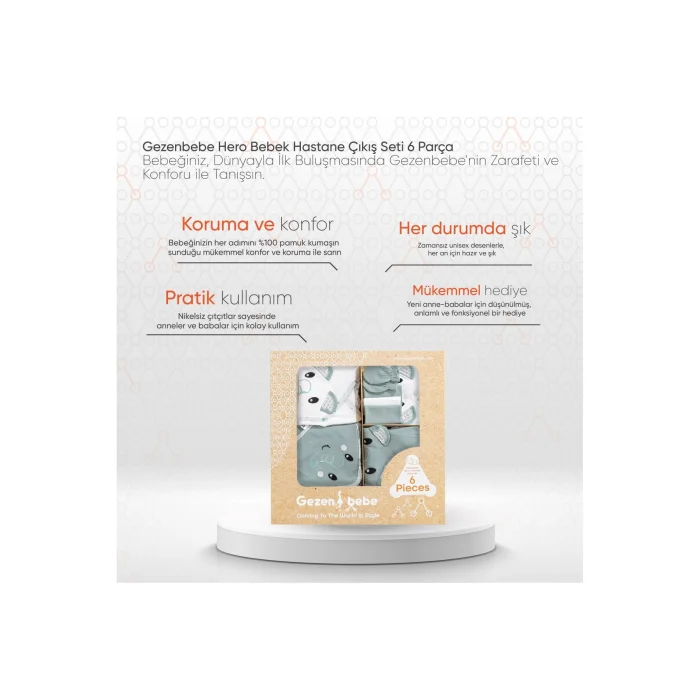 Product Description:Gezenbebe Hero Baby Hospital Outlet Set 6 Pieces: The Perfect Start for the First Big Day in Your Baby's Life! Prepare your newborn for the first important day in his life – the day he leaves the hospital. This special set from Gezenbebe is specially designed to offer your baby both comfort and style. With its gezenbebe quality and iconic patterns, it makes your little hero feel special from the beginning. Set Contents:EMBROIDERED HAT: Soft, breathable and embroidered hat with unique Gezenbebe heroes that will keep your baby's head warm. EMBROIDERED APRON: An embroidered apron inspired by the four heroes of Gezenbebe, offering a stylish solution for small accident moments. EMBROIDERED ZIBIN: A delicate staple decorated with iconic Gezenbebe patterns that will keep your baby clean and dry. BOOTIES: Comfortable pants with integrated booties that keep tiny feet warm. GLOVES: Soft gloves so your baby doesn't scratch himself. EMBROIDERED SHORT SLEEVE BODYSUIT: Breathable and soft short sleeve bodysuit that gently hugs your baby's skin, enriched with embroidery details from our four heroes. Standout Features:GEZENBEBE SIGNATURE:This set offers more than just a Hospital Exit Set; It is a fashion statement of Gezenbebe with its special patterns and detailed embroidery. FULL PROTECTION: Each piece in this set has been carefully selected to ensure that your baby is protected from head to toe. UNIQUE DESIGN OF GEZENBEBE: Elephant, Koala, Teddy Bear and Rabbit; The four beloved heroes of Gezenbebe bring your baby together with a unique elegance with this set.ULTIMATE COMFORT: Made of 100% breathable cotton fabric, this set offers your baby the highest comfort. UNISEX ELEGANCE: With its fashionable patterns, your baby feels ready in every sense. EASY TO USE: Nickel-free snap buttons offer quick and convenient use. GREAT GIFT: An ideal gift for new parents or your own baby. Technical Details:Size Options: 0-3 months, 3-6 months, 6-9 monthsColor Options: Bunny, Elephant, Koala, Teddy (Organic). Review the size chart before completing the order. With the Gezenbebe Hero Baby Hospital Exit Set, your baby is ready to meet the world in a stylish and comfortable way. Every moment is precious, and with Gezenbebe, these first moments are even more special.