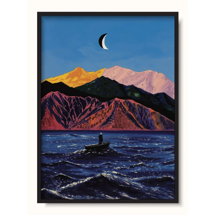 A person standing inside a small boat on a rough sea, colorful mountains and a crescent moon in the background.