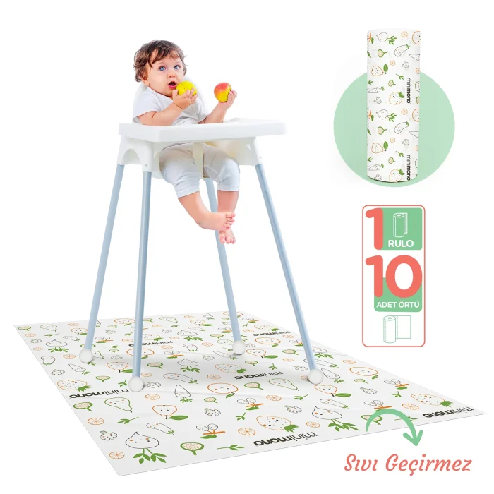 High Chair & Activity Cover | Cute Fruits Includes 1 roll.; One roll contains 10 perforated covers; Each cover is 100×120 cm in size, protecting the floor during meal and play time! It will be indispensable in all your activities with its practical and liquid-proof surface on the ground at mealtime, on the ground at play time, in the garden at picnic time, on the table at painting time.; With its fun designs, the joy of babies is your savior, that minimono!