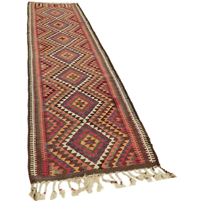 Herki Kilim Rug 84 cm width and 368 cm length and the pile height is 5mm, the approximate weight of the rug is 8 kg. It’s % 100 hand knotted wool and goat hair rug. It’s made from the natural dye.