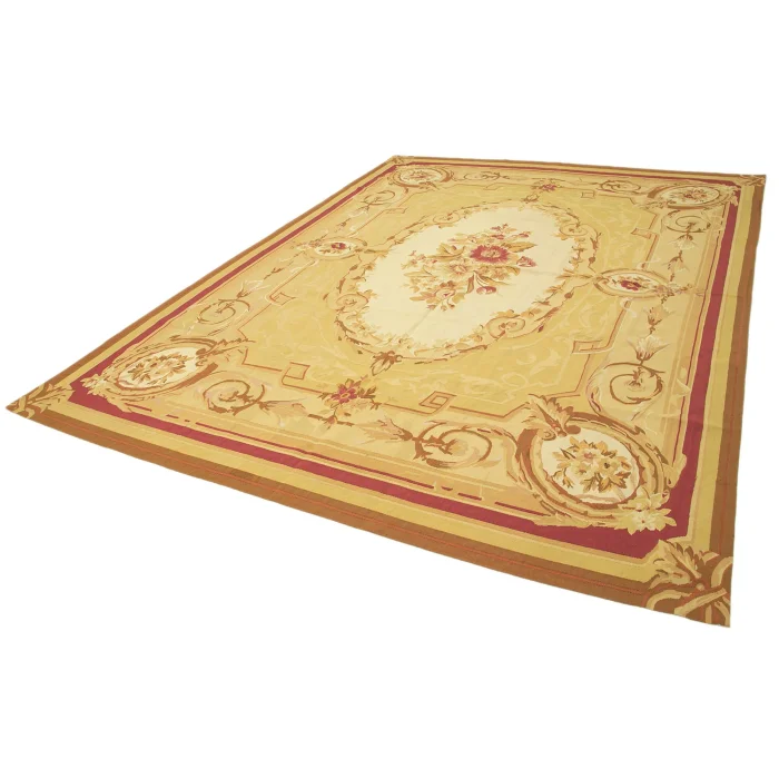 The Aubusson Rug is 266 cm wide by 361 cm long and about 5 mm thick. It weighs an average of 11 kg. It is made with hand-spun wool and cotton. It takes its colors from root dyes obtained naturally.