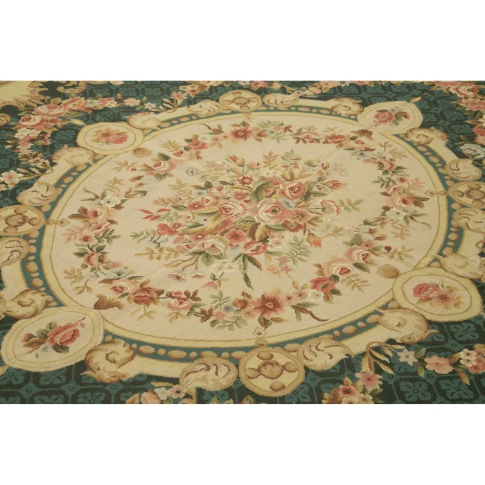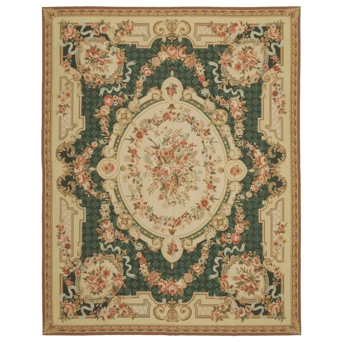 The Needlepoint Rug is 238 cm wide by 302 cm long and approximately 5 mm thick. It weighs an average of 8 kg. It is made with hand-spun wool and cotton. It takes its colors from root dyes obtained naturally.