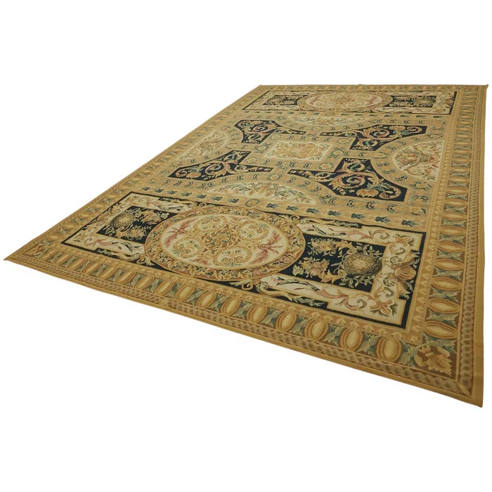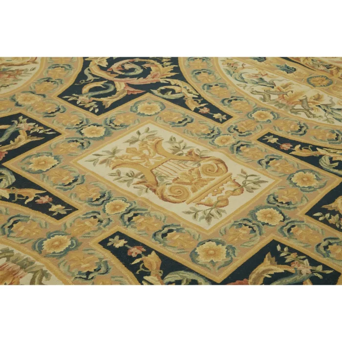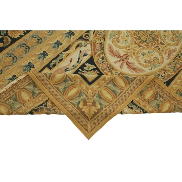 The Aubusson Rug is 297 cm wide by 448 cm long and about 5 mm thick. It weighs an average of 15 kg. It is made with hand-spun wool and cotton. It takes its colors from root dyes obtained naturally.