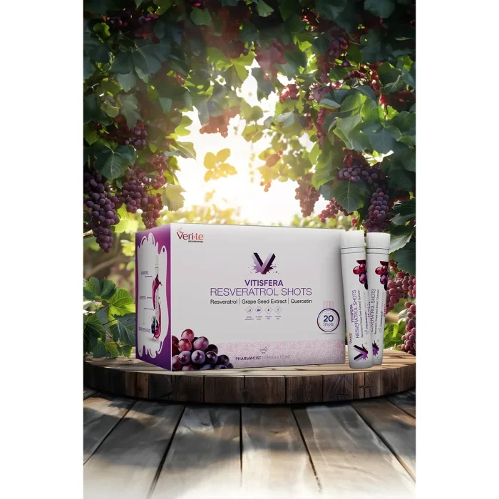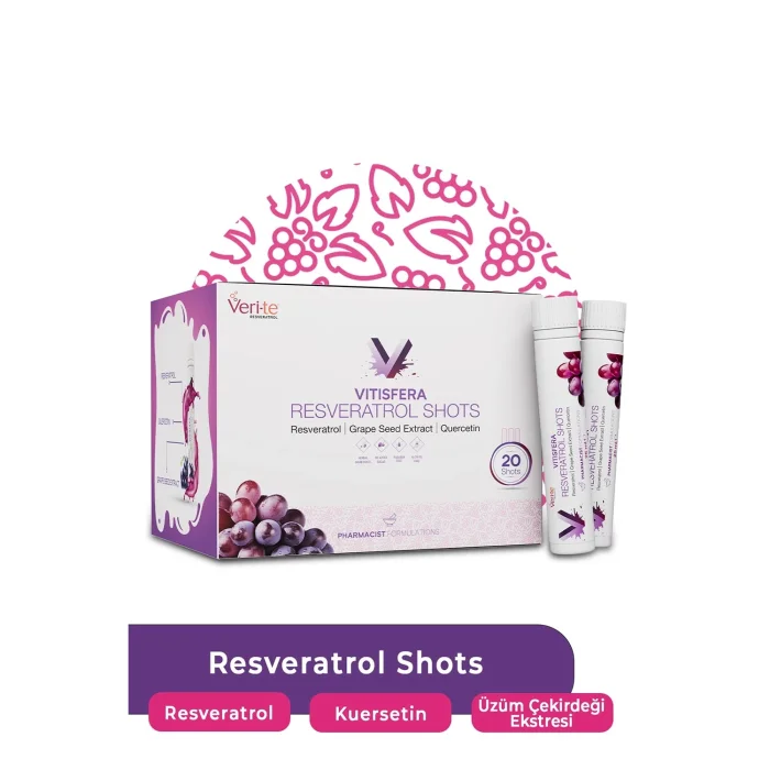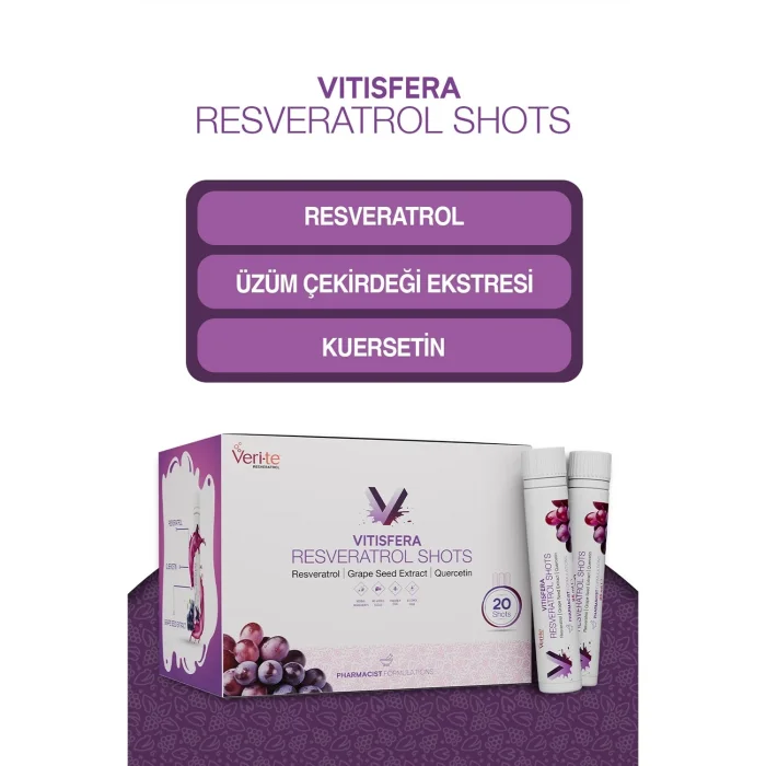 Resveratrol in the content of Vitisfera Resveratrol Shot Forest Fruits Flavored Food Supplement is obtained from Veri-Te®, Switzerland's registered and patented trans-Resveratrol brand, while Quercetin is obtained from Sophorae Japonica plant with 95% purity and Grape Seed Extract is obtained from natural grape seed with 96% purity.