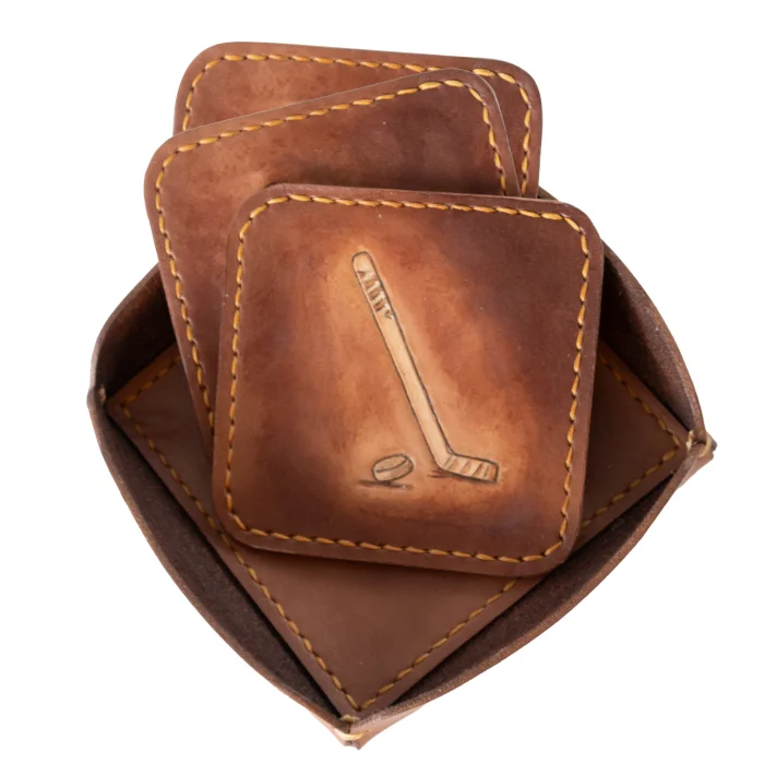 Product: Handmade Genuine Leather Coaster Set - Ice Hockey Figure, Sustainable Production
