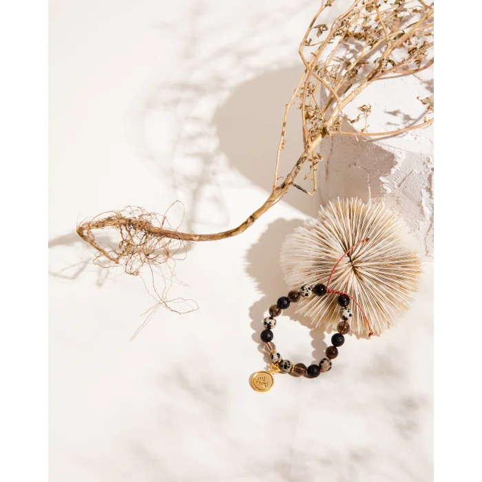 of our lives, tobe more central, consistent, efficient, disciplined and durable in our lives Smoky Quartz, Quail Jasper and Lava Stone It was hand-knotted with 14K gold-plated brass details on crimson thread.