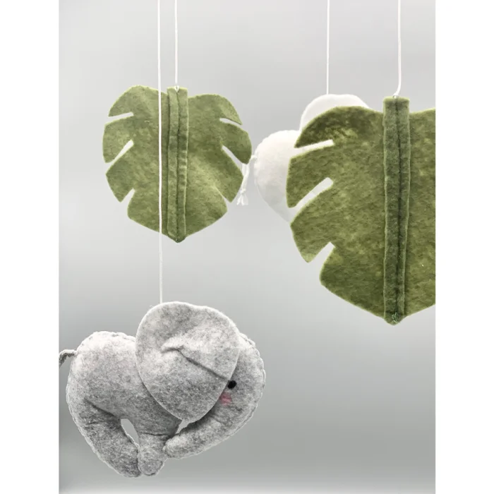 This revolving model, which consists of elephant figures made of felt and decorative leaves, will easily adapt to many rooms with its natural color tones.