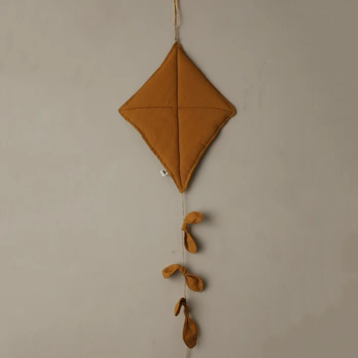 It is 100% cotton muslin fabric on the outside and fiber filled on the inside . Complete with jute string, this design resembles a real kite.
