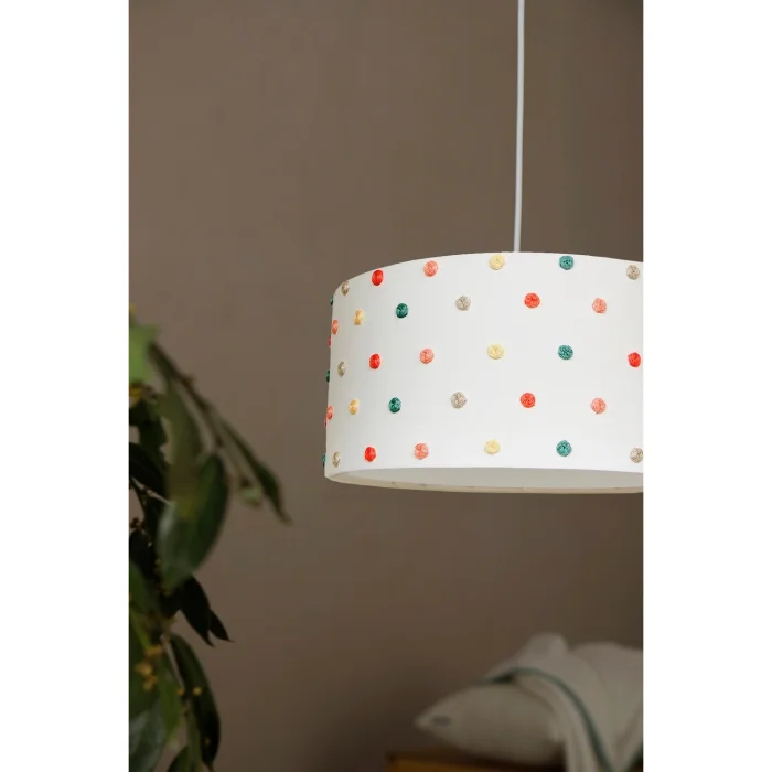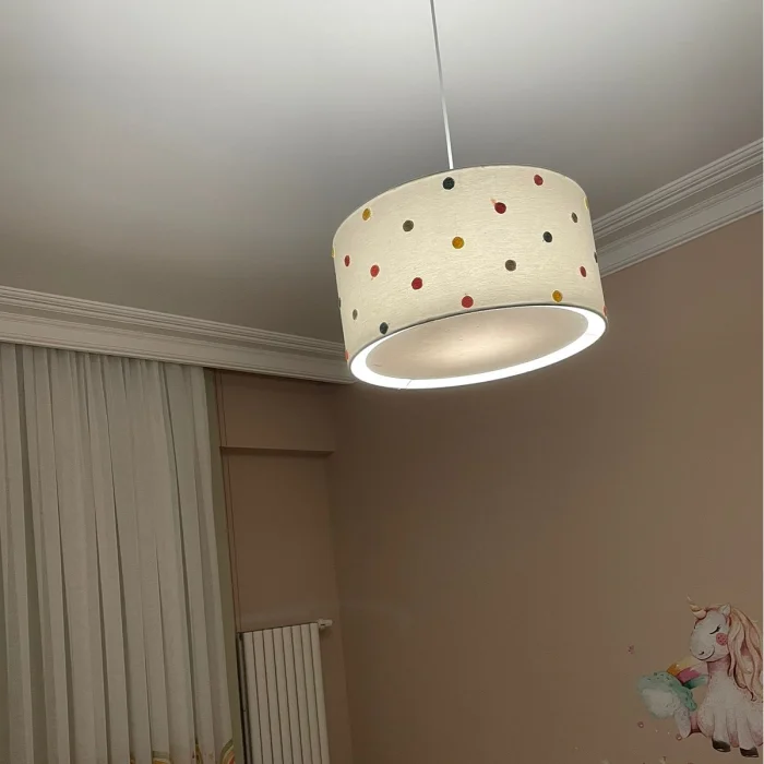 White colored fabric cotton-plated, colourfull rococo-embroidered lighting is a unique choise for our little one’s rooms. The lower part of this lighting is also semi closed and provides a pleasant and indirect illumination inside the room.