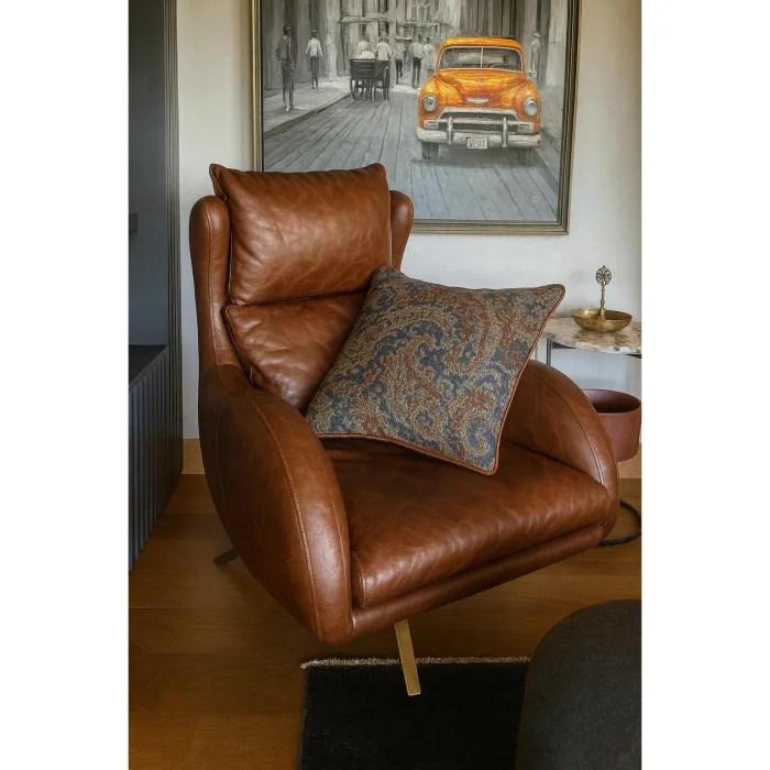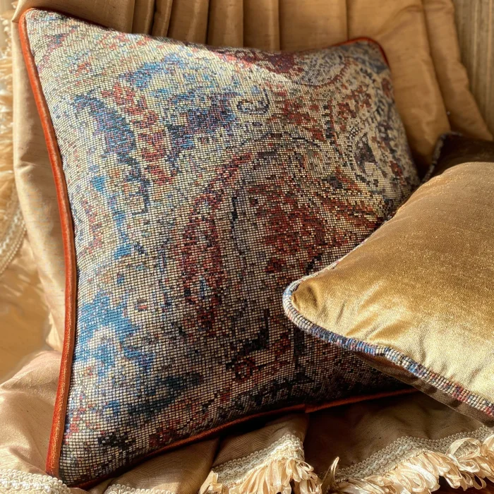 Natural viscose special woven effective paisley pattern decorative pillow with silky velvet roving surrounding it. The decorative cushion has a concealed zip fastener and is sent as filled.