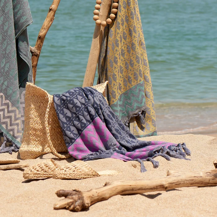 100% cotton, woven peshtemal towel, traditional hand knotted tassels.