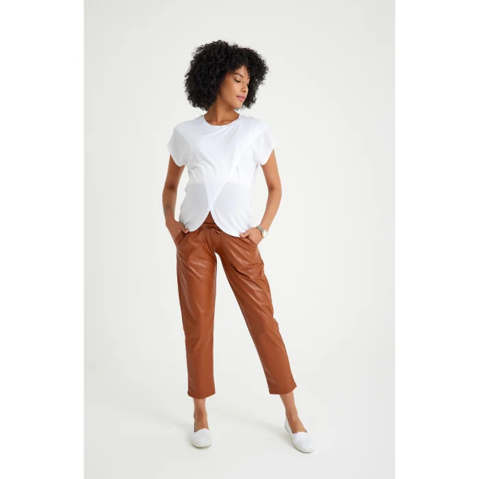 A trousers that provide elegance with their matte leather appearance and comfort with their cut, independent of time and place. The cotton part wraps the belly softly and feels good, while the cut that tapers towards the leg makes you look slim and elegant. After birth, you can continue to use the cotton part by folding it, and you can support the healing of your cesarean section stitches, if any.