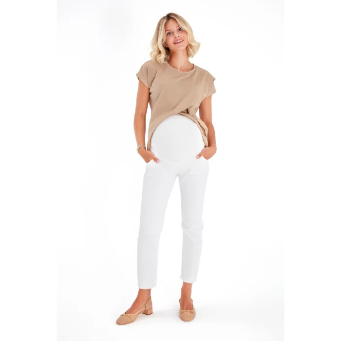 The white trousers, which are the savior of every moment, are made of a denim-like fabric! It's as tidy as denim and as comfortable as a regular pair of pants. Get comfortable with the soft and supple part that wraps around the belly throughout pregnancy. After birth, use a fold to tidy up your abdomen, which has not yet regained its former form. Thanks to its fit and model, you can wear it stylish or sporty, and you can feel good for many days with a single piece.