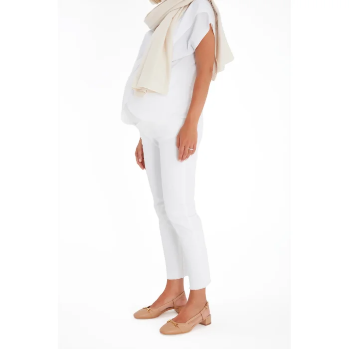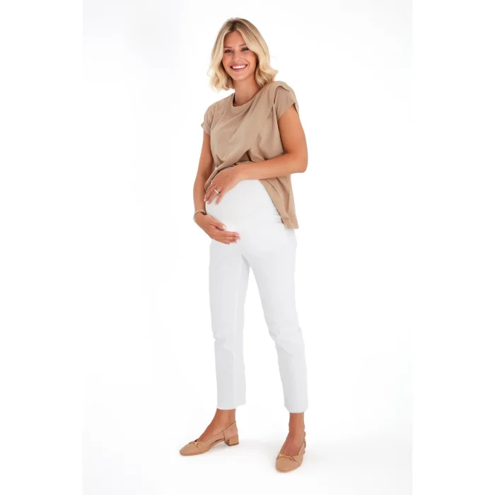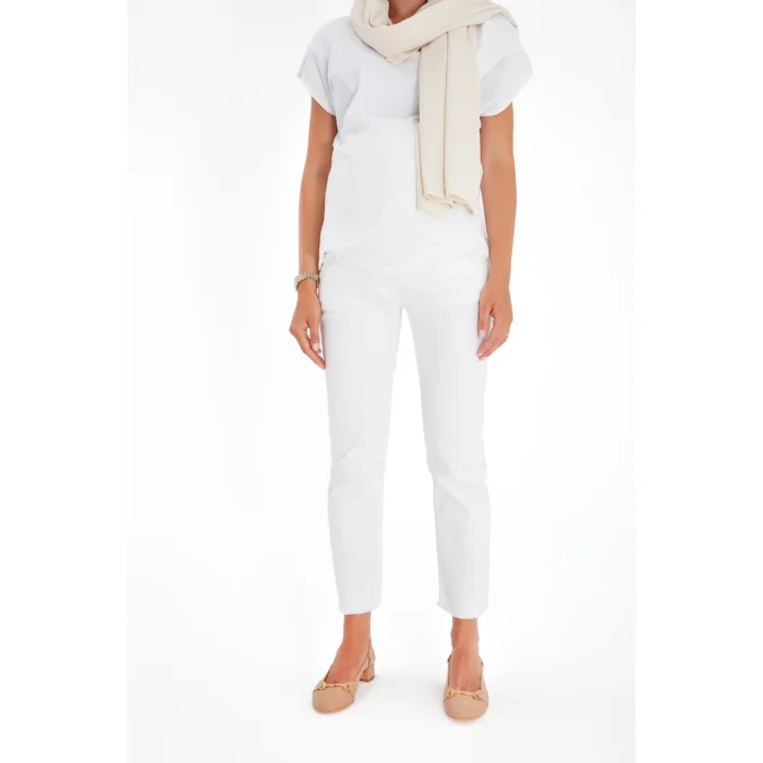 The white trousers, which are the savior of every moment, are made of a denim-like fabric! It's as tidy as denim and as comfortable as a regular pair of pants. Get comfortable with the soft and supple part that wraps around the belly throughout pregnancy. After birth, use a fold to tidy up your abdomen, which has not yet regained its former form. Thanks to its fit and model, you can wear it stylish or sporty, and you can feel good for many days with a single piece.