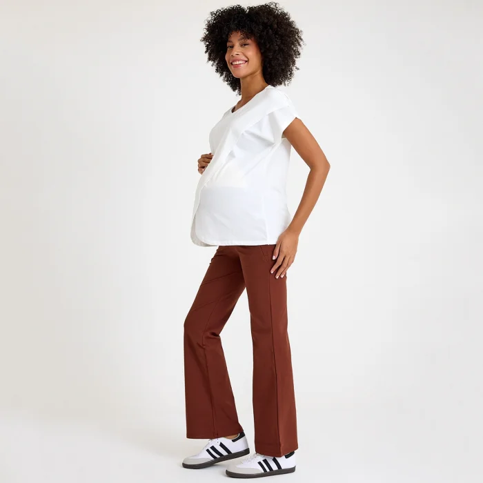 Warm flare maternity trousers with warm inner texture. Zippered front pockets and high waist. Very durable and breathable fabric.