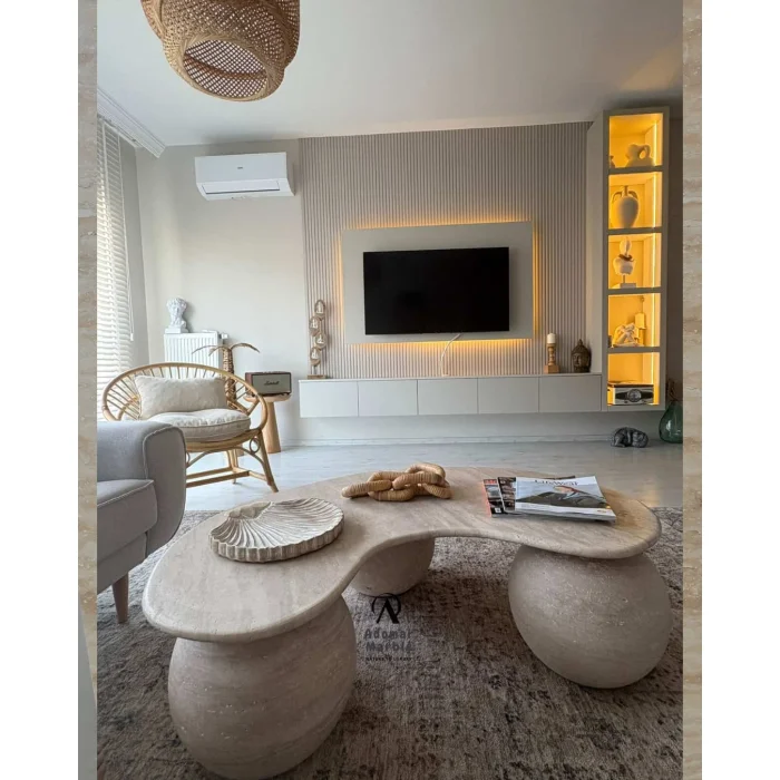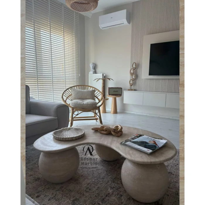 offers both luxury and aesthetics with its handcrafted spherical legs (diameter 35 cm) and 70x120 cm long bean-shaped table.