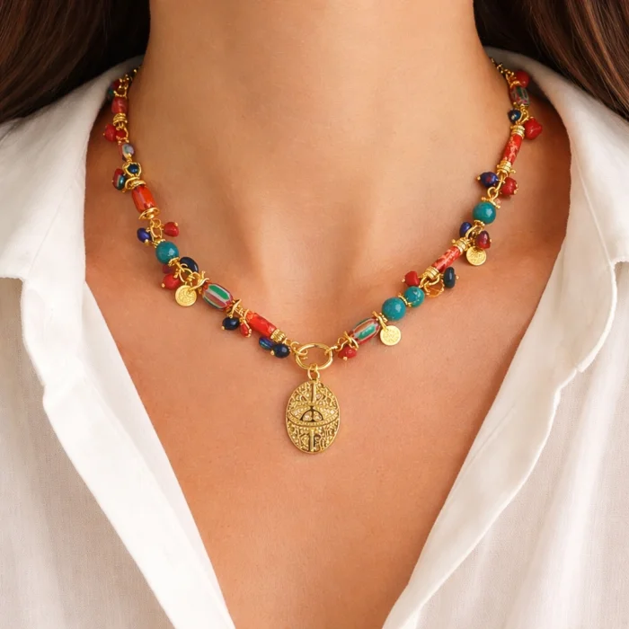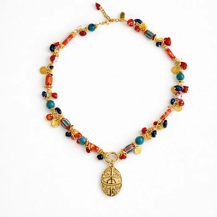 MATERIAL:  Jade, Coral, Mother-of-Pearl, Varicose Veins, Ghana Beads, Gold Plated Intermediate Details, :elik Eye Pendant