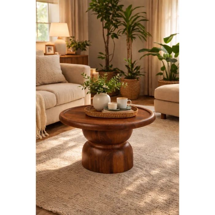 Round Wooden Coffee Table - Classic Modern Design With A Single Leg - 80 Cm