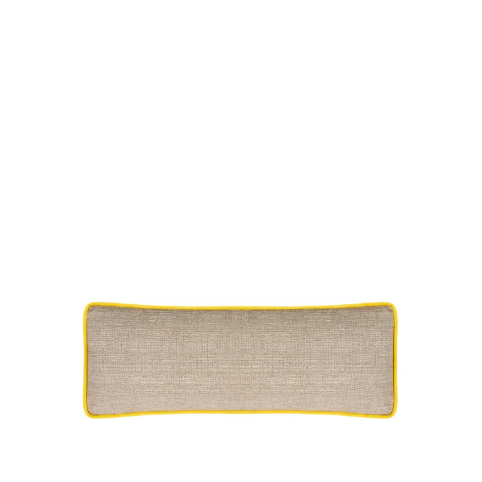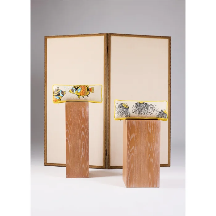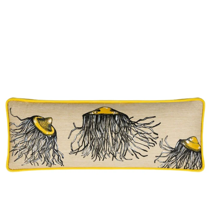 The decorative pillow offers an original design with jellyfish figures, all hand-painted. Black and yellow details embroidered on a natural tone background create a moving expression in the composition with three different jellyfish forms. Tentacle details worked with fine brush strokes add depth to the pillow, while contrasting with the yellow parts. The velvet yellow piping on the edges completes the design integrity of the pillow by clarifying the line. This handcrafted pillow is designed to add character to decorations with artistic touches. The inner filling is fiber and filled by hand. It has a hidden zipper. Product Size: 25x65x4 cm. Care Instruction: Dry cleaning only. Material: Linen and Velvet Fabric.