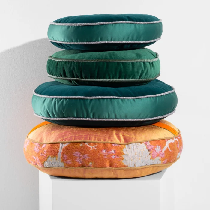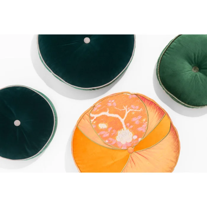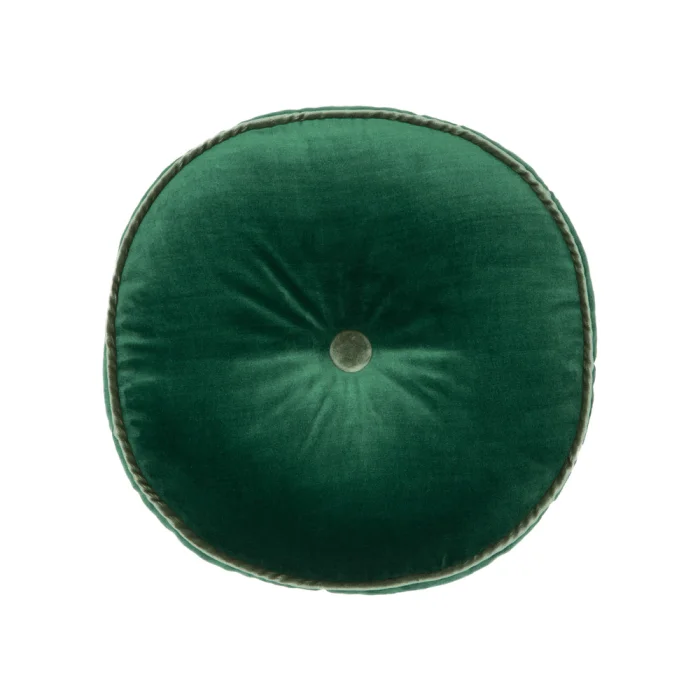Round cushion with top and back section in velvet fabric. Covered button at center. Features silk fabric details on side. Filled by hand. Fiber fill.