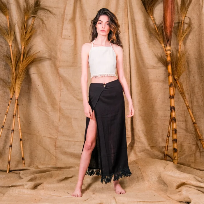 Peitho, the hand fringed wrap skirt fastened with coconut button. The beautifully handwoven cotton and linen fabric on the wooden looms embodies a desired natural look.