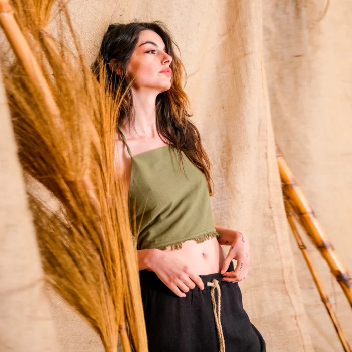 Sat Nam, the tie-back frayed halter top. The beautifully hand-loomed organic cotton and linen mixture top, is an exceptionally soft hand-feel. Team it with skirts.The model is 1.74 cm tall and wears a size S/M Chest: 83cm Waist: 60cm Hips: 87cm