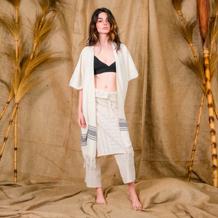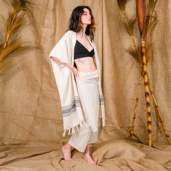 Sensei, the timeless handwoven kimono with fringed hem. Wear it from day to night, whilst having a sunset drink or a chill day by the beach. Should you choose to wear it as a beach cover up, the cotton heavy, handwoven light-weight fabric is highly absorbent and dries quickly.