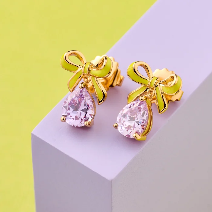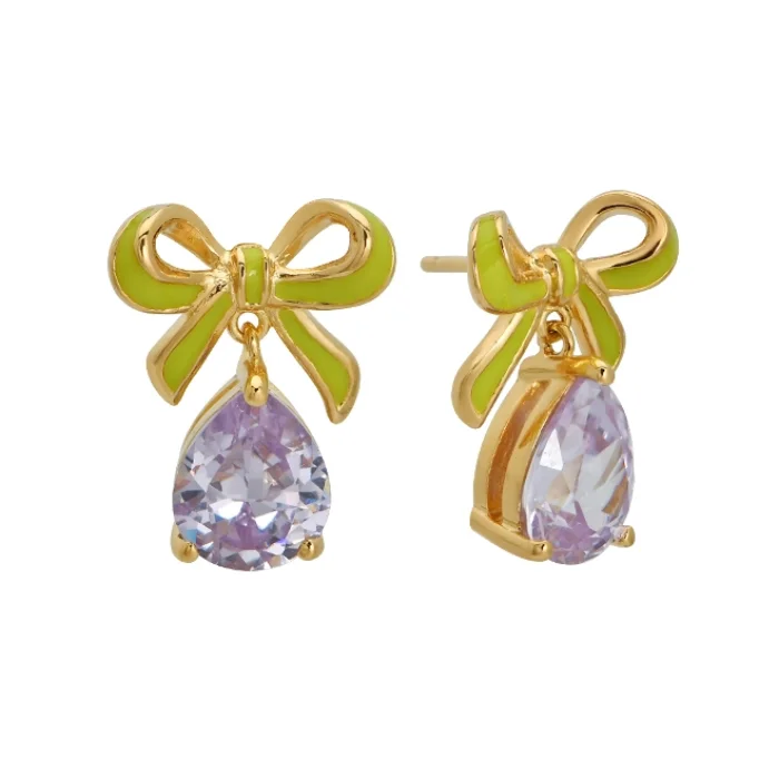 Say hello to our latest obsession - The Amelia Enamel Bow collection. These fun and colourful stud earrings were designed to add a pop of personality to any outfit and bring the wearer a real glimmer of joy each time they put the statement styles on. This sculptural earring style feature a hand-enamelled lime green 3D bow that holds onto a lilac teardrop cut cubic zirconia. The Amelia Bow collection makes for a truly unique gifts and the perfect accessories to express yourself. Available in four vibrant formats and with matching rings, which ones will you collect? FEATURES Packaged in a vintage look velvet gift box Stud Dimensions - 14mm Wide x 18mm Drop Recycled 925 Sterling Silver Post and Scalloped Earring Backs Bow is hand-crafted in environmentally friendly Eco Brass Durable Recycled 18k Gold Plating Hand painted Lime Green Enamel Bow Lab Grown Lilac Cubic Zirconia Please note we are unable to process returns or exchanges on earrings