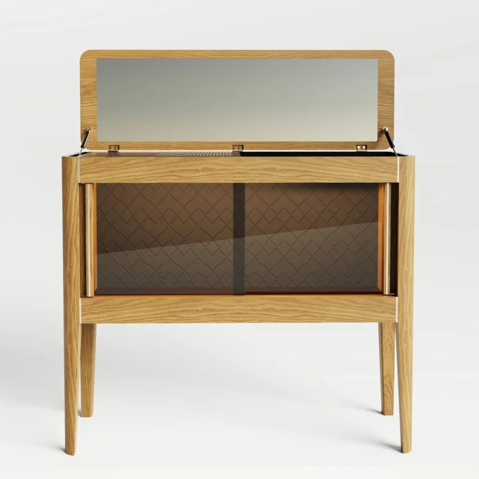 Handcrafted from oak wood, the solid oak bar cabinet with LED lights and chrome detailed slats adds elegance and functionality to your cocktail preparations. Equipped with LED lights, a chrome cutting tray and a wine glass holder, this cabinet offers a solution that is both decorative and practical.