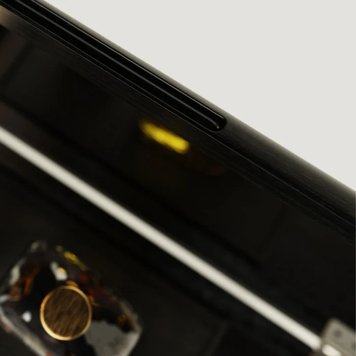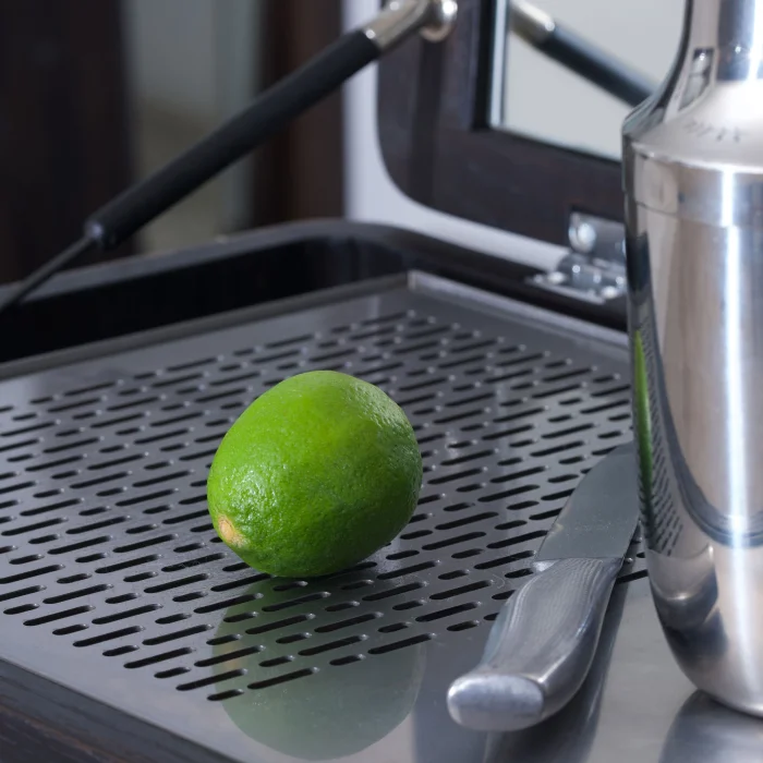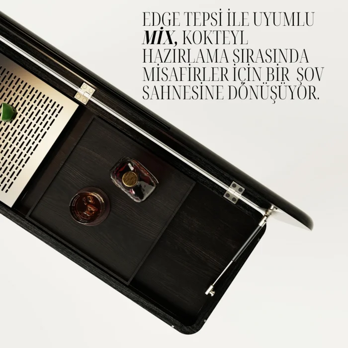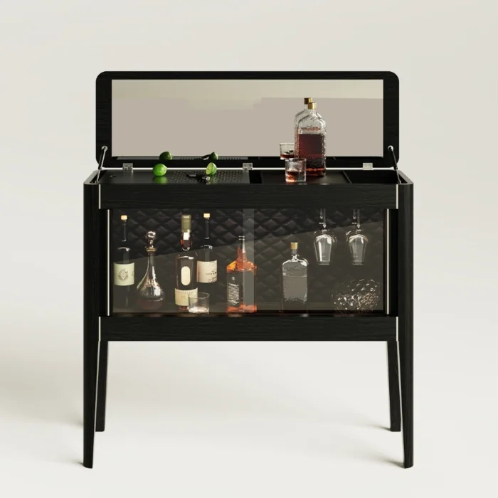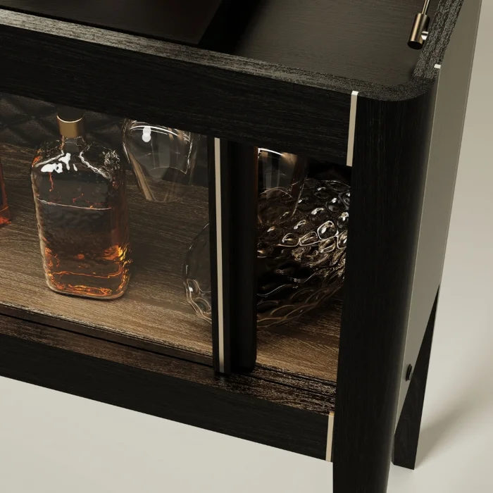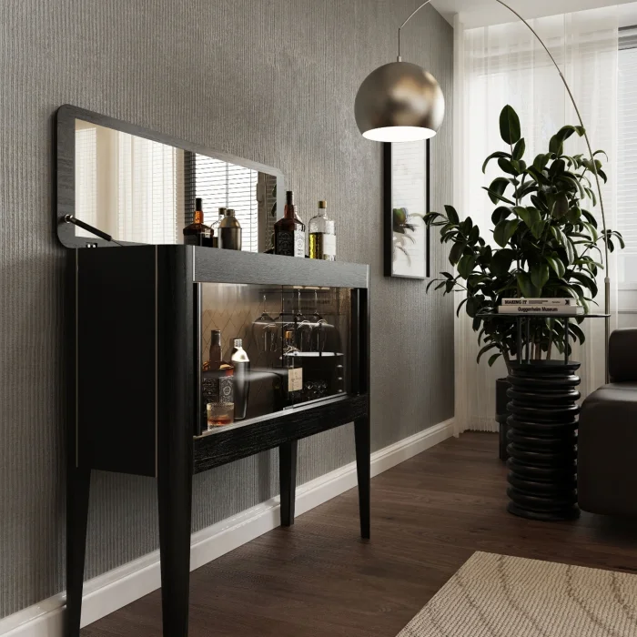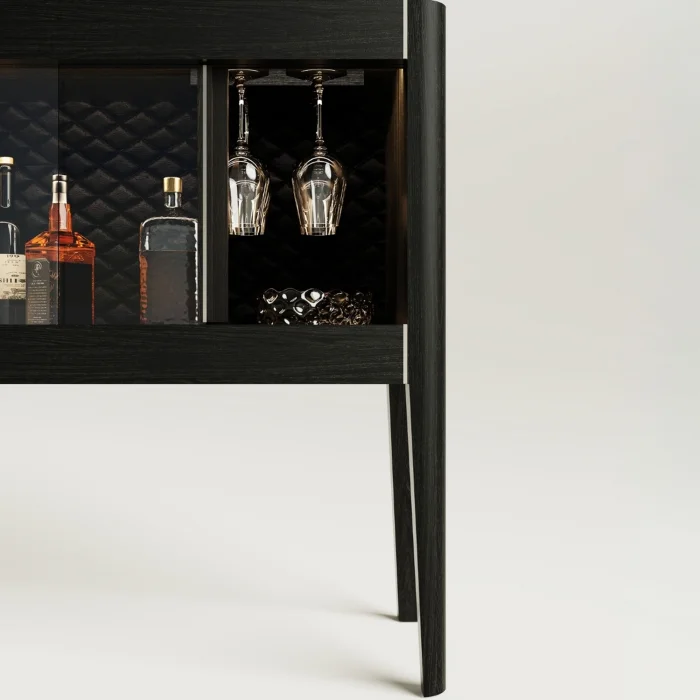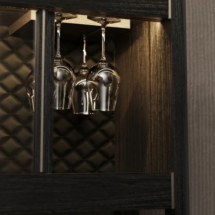 Handcrafted from oak wood, the solid oak bar cabinet with LED lights and chrome detailed slats adds elegance and functionality to your cocktail preparations. Equipped with LED lights, a chrome cutting tray and a wine glass holder, this cabinet offers a solution that is both decorative and practical.