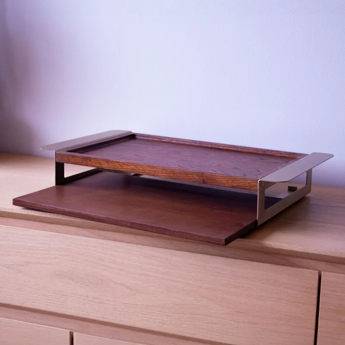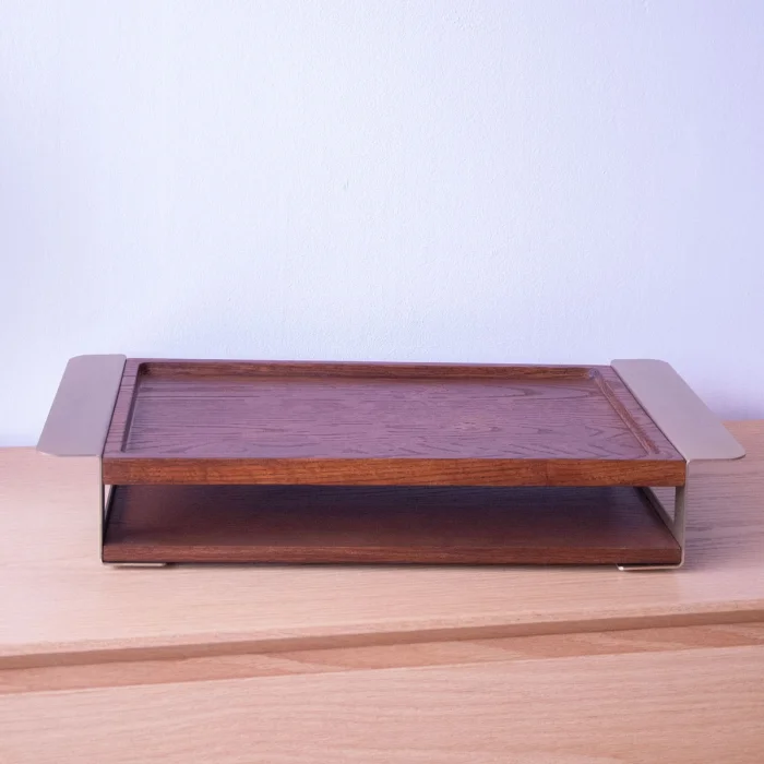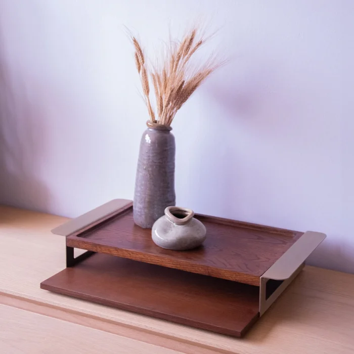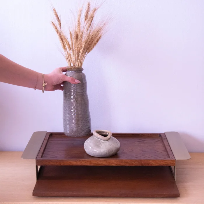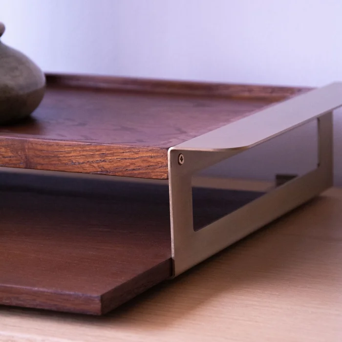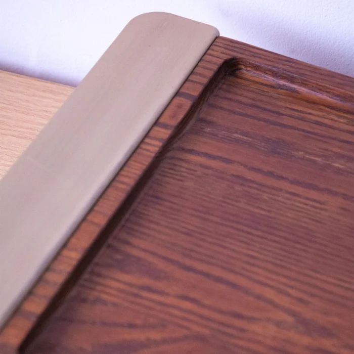 The solid wood serving tray set with gold handles has a design that draws attention with its elegance and durability. Easy to carry thanks to their metal handles, these modernly designed oak trays are ideal for all your serving and presentation needs, from breakfast to dinner.