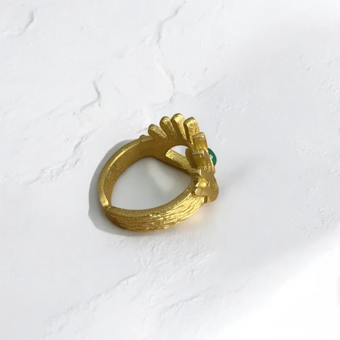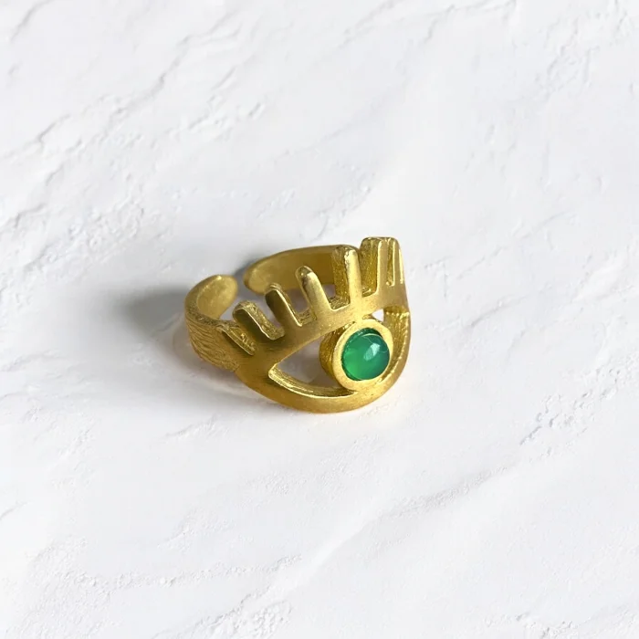 It is made of natural stone and brass. Since it is adjustable, it is compatible with all fingers. Due to the 100% natural materials, there may be slight variations in color and pattern.