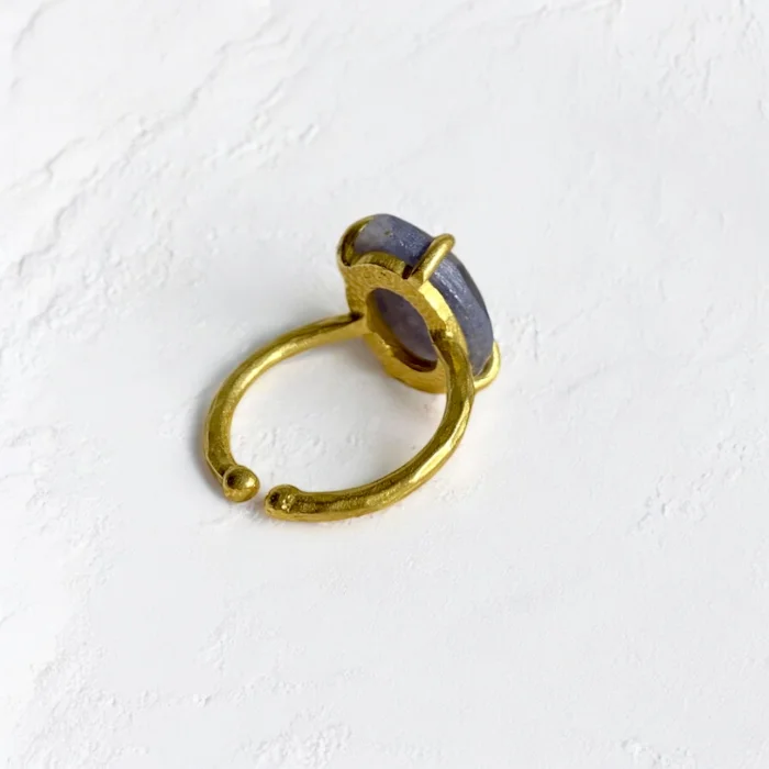 It is made of rosecut Iolite (Water Sapphire) stone and adjustable raw brass.