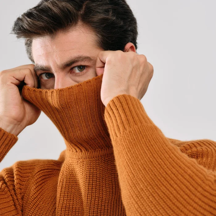 • Model measurements are height/187, weight/80, chest/105, waist/84 cm, and the model wore size L of this sweater in the shooting.