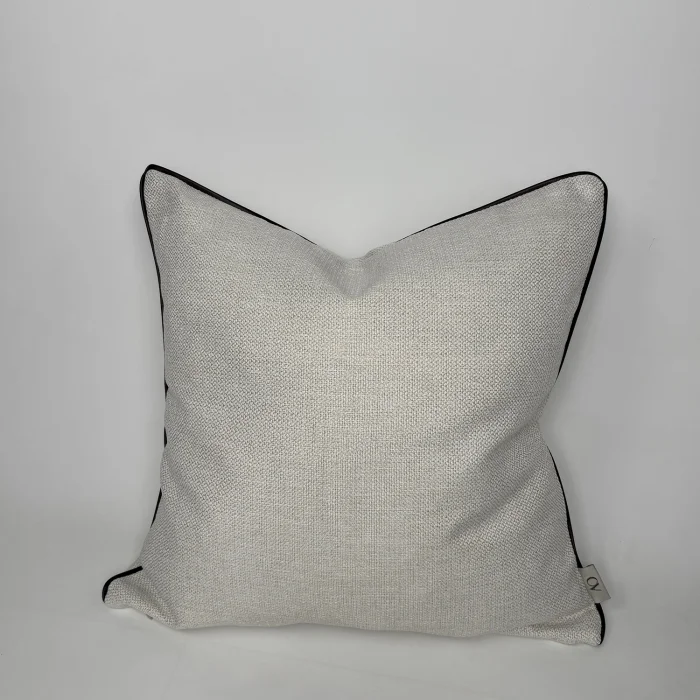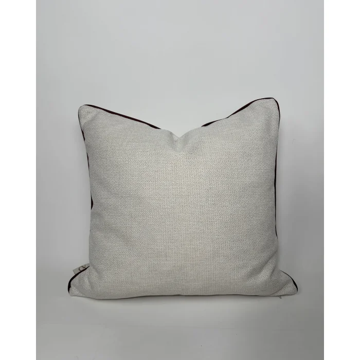 The edges of white beige linen are corfed with burgundy faux leather. The product is sold as a hollow only cover. The products are 45x45 and 50x30 sizes. 45x45 highly conforms to standard interiors in the house.
