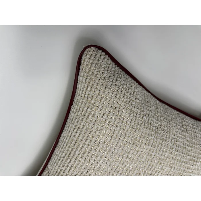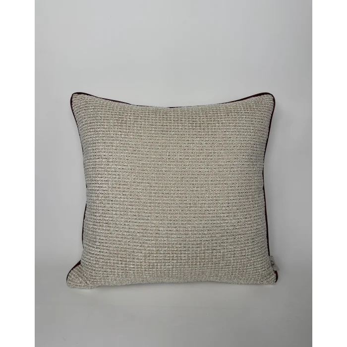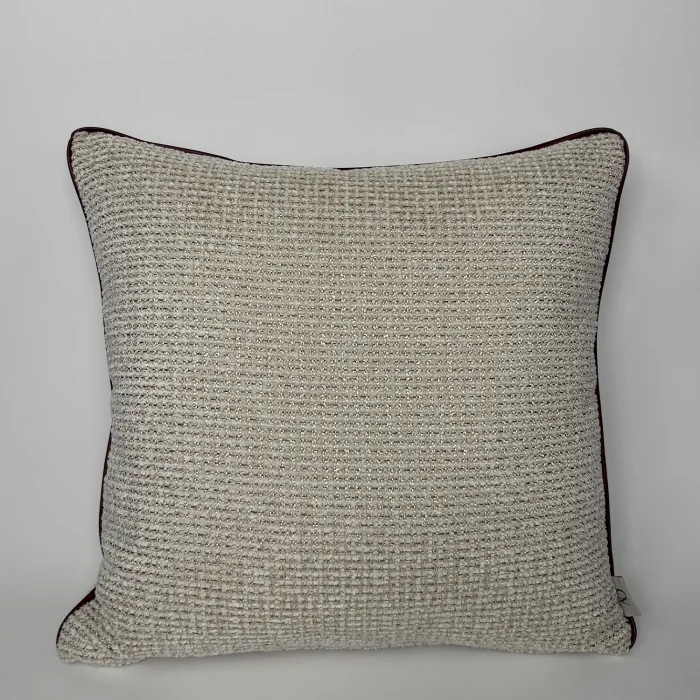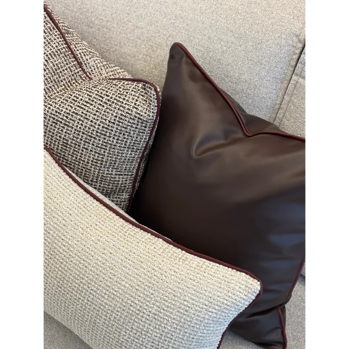 The beige tweed cushion edge has a faux leather burgundy rib. The product is sold as a hollow only cover. The products are 45x45 and 45x30 sizes. 45x45 highly conforms to standard interiors in the house.