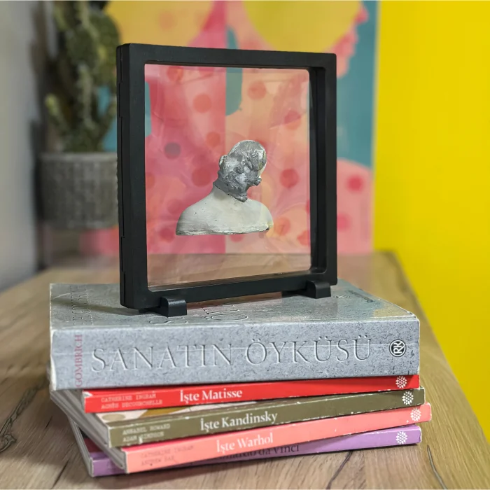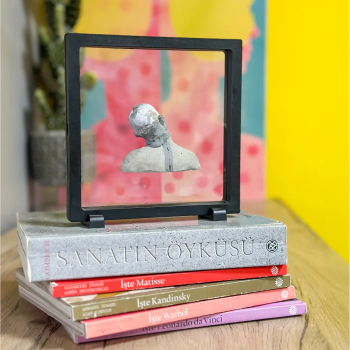 It is an original work that is completely handmade. Since it is a work of art, it will be sent with a signed certificate of authenticity. The piece in the acrylic frame is produced using concrete. It can also be used for home or office decoration.