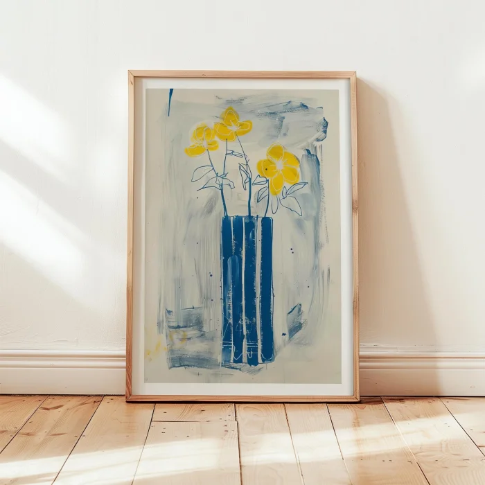 Product: Abstract Vazo Ve Çiçekler - Mavi Sarı Wooden Framed Wall Art