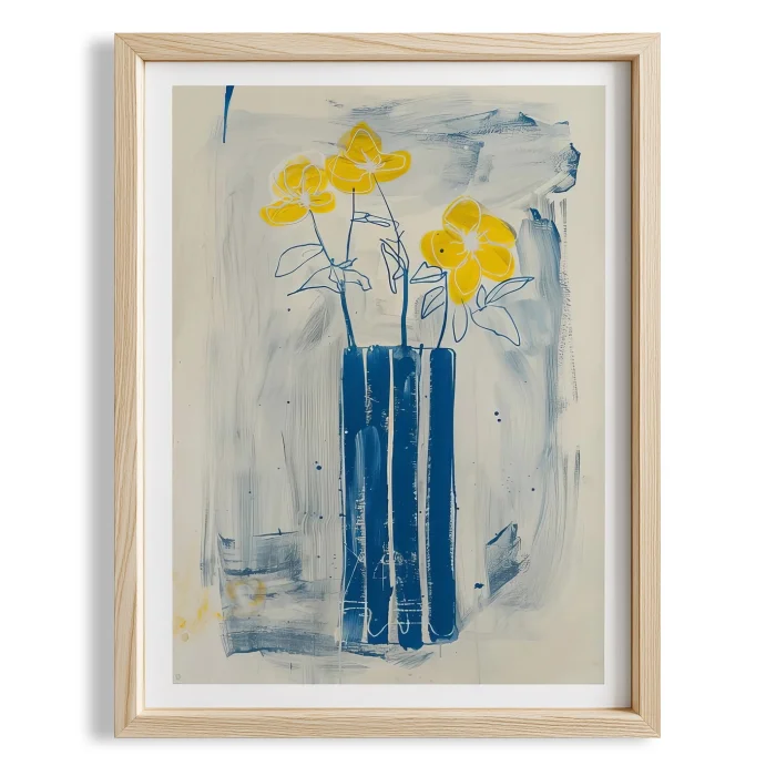 Product: Abstract Vazo Ve Çiçekler - Mavi Sarı Wooden Framed Wall Art