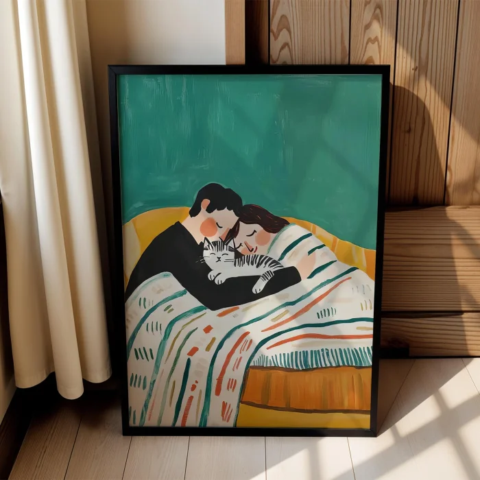 Product: Aşkın Sessizliği - Kedili Aile Wooden Framed Wall Art