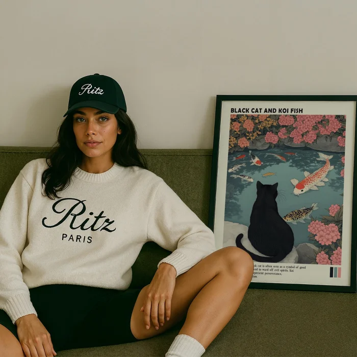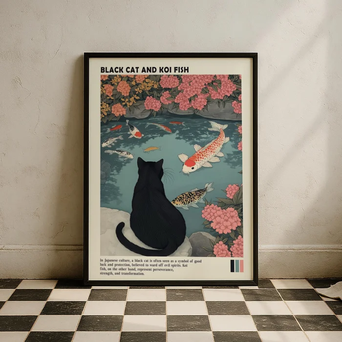 Product: Black Cat And Koi Fish Wood-framed Art Print