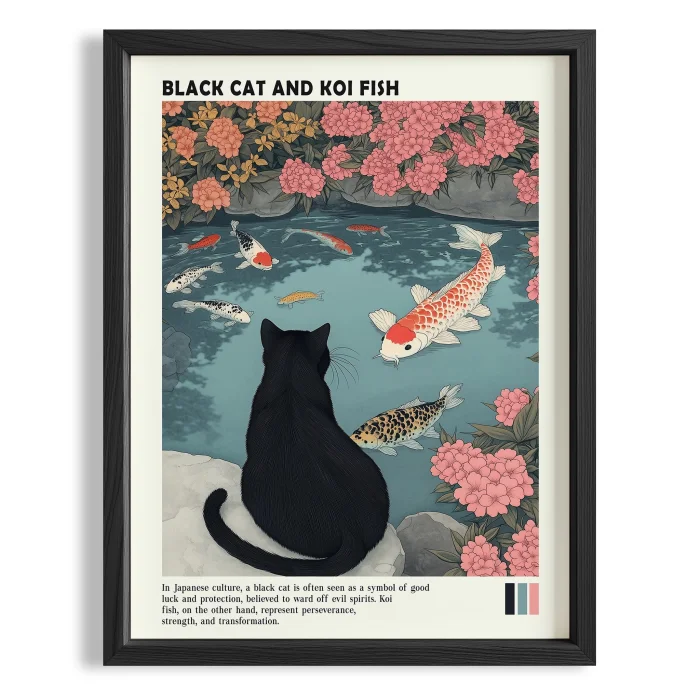 Product: Black Cat And Koi Fish Wood-framed Art Print