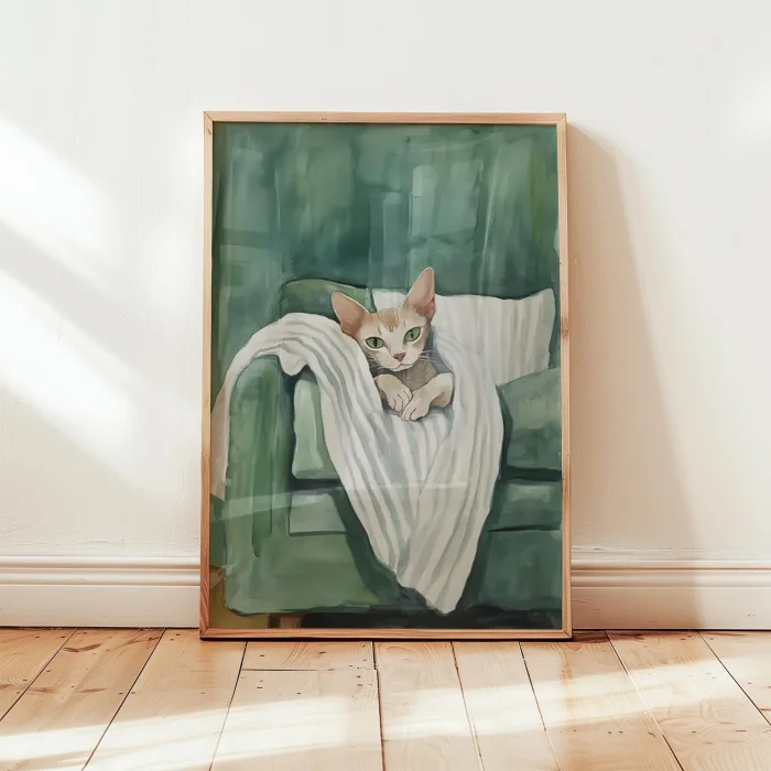 Product: Cat & Blanket Iii - Emerald Background Wooden Framed Print