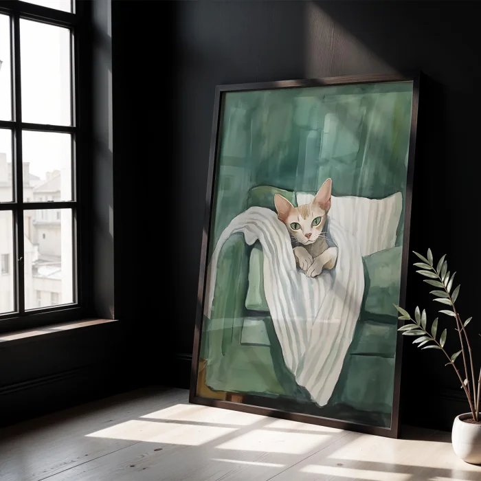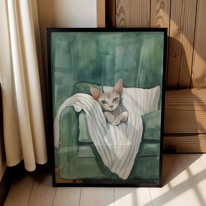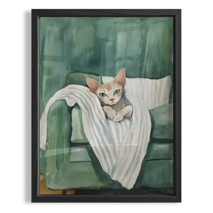 Product: Cat & Blanket Iii - Emerald Background Wooden Framed Print