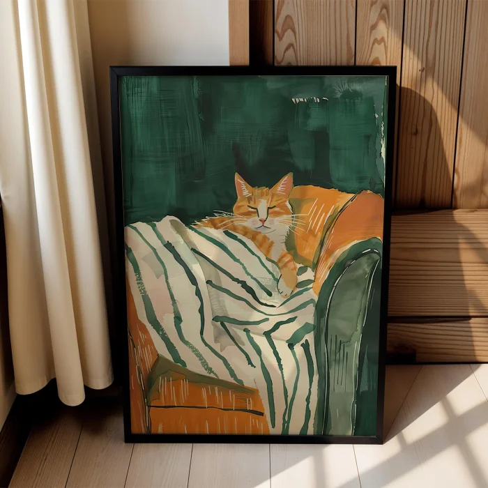 Product: Cat Portrait - Emerald Striped Wooden Framed Wall Art